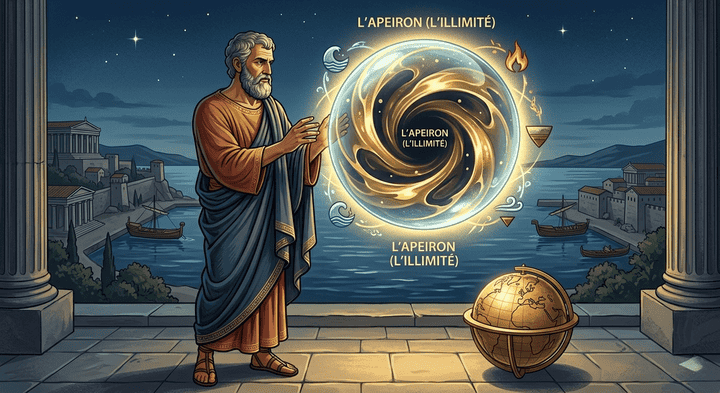 Pour Anaximandre, c’est l’Apeiron (l’illimité).C’est la naissance de la physique : on cherche une cause matérielle et rationnelle aux phénomènes.