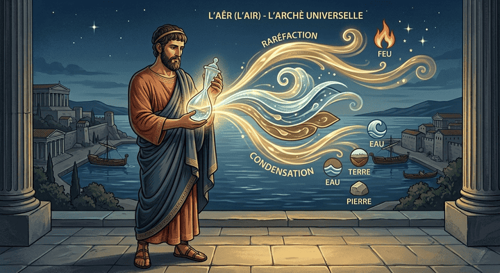 Anaximène de Milet (v. 585 – 528 av. J.-C.), élève d’Anaximandre, a proposé que l’air (Aêr) est l’Archè, l’élément premier. Il pensait que Thalès avait raison sur le fond, mais qu’il manquait de précision sur la « mécanique » du monde. Il a été le premier à proposer un mécanisme physique pour expliquer comment une seule chose peut devenir toutes les autres : la condensation et la raréfaction.